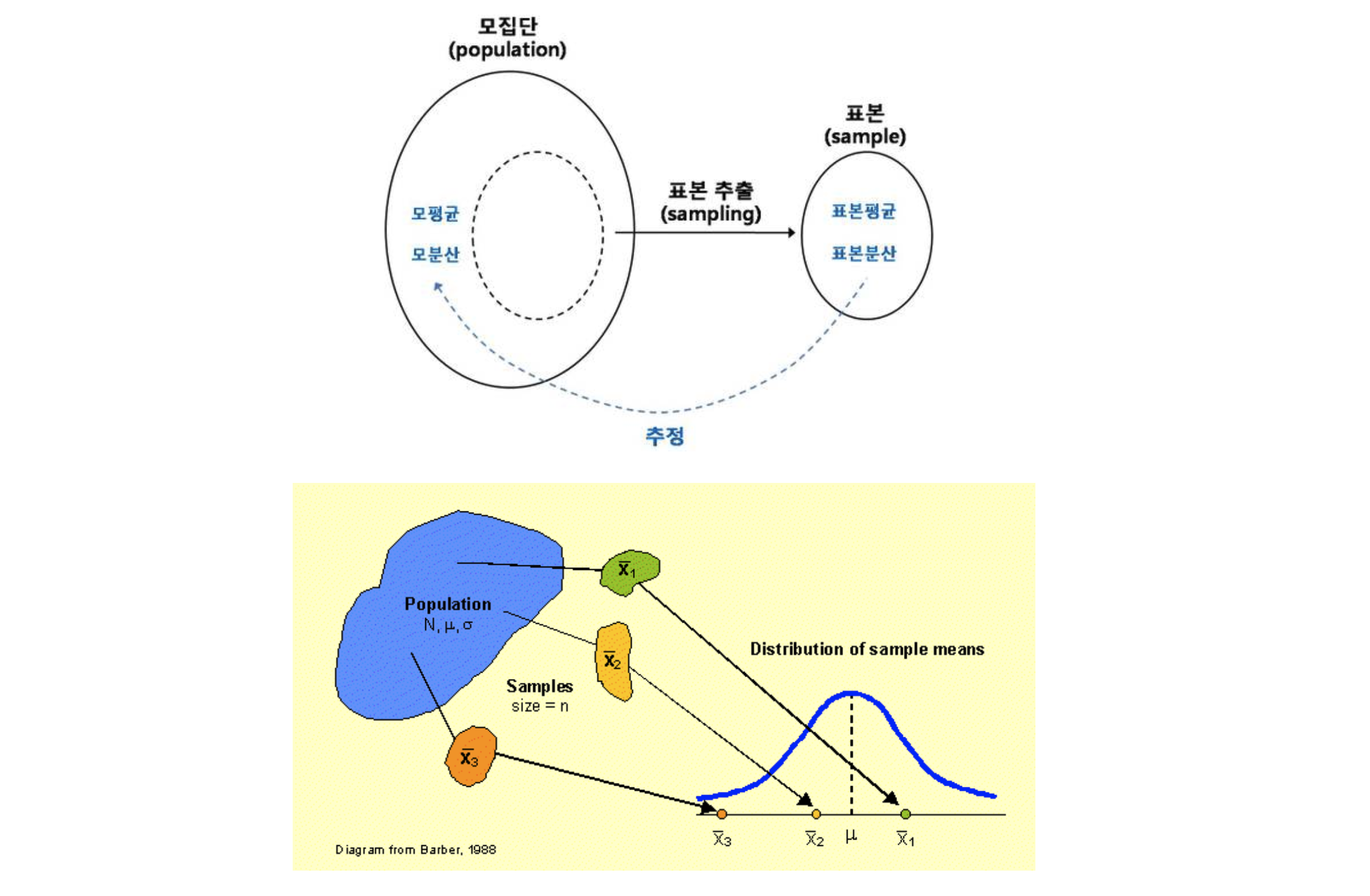 - 표본(sample): 모집단의 부분집합으로 모집단의 특성을 파악하기 위해 수집된 개별 집단
