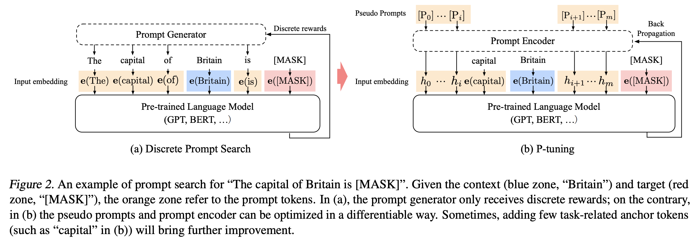 이때 prompt $p$의 역할을 context $x$, target $y$와 prompt를 엮어 template $T$로 만드는 것으로 정의해볼 수 있다. 아래 그림에서 처럼 "The capital of Britain is [MASK]."이라는 template이 있을 때 "The capital of ... is ... ."가 prompt, "Britain"이 context, "[MASK]"가 target이 된다.