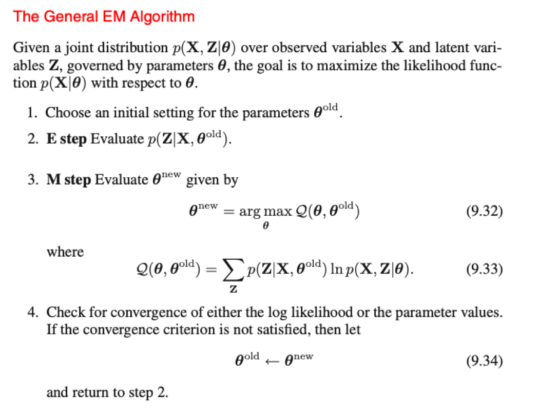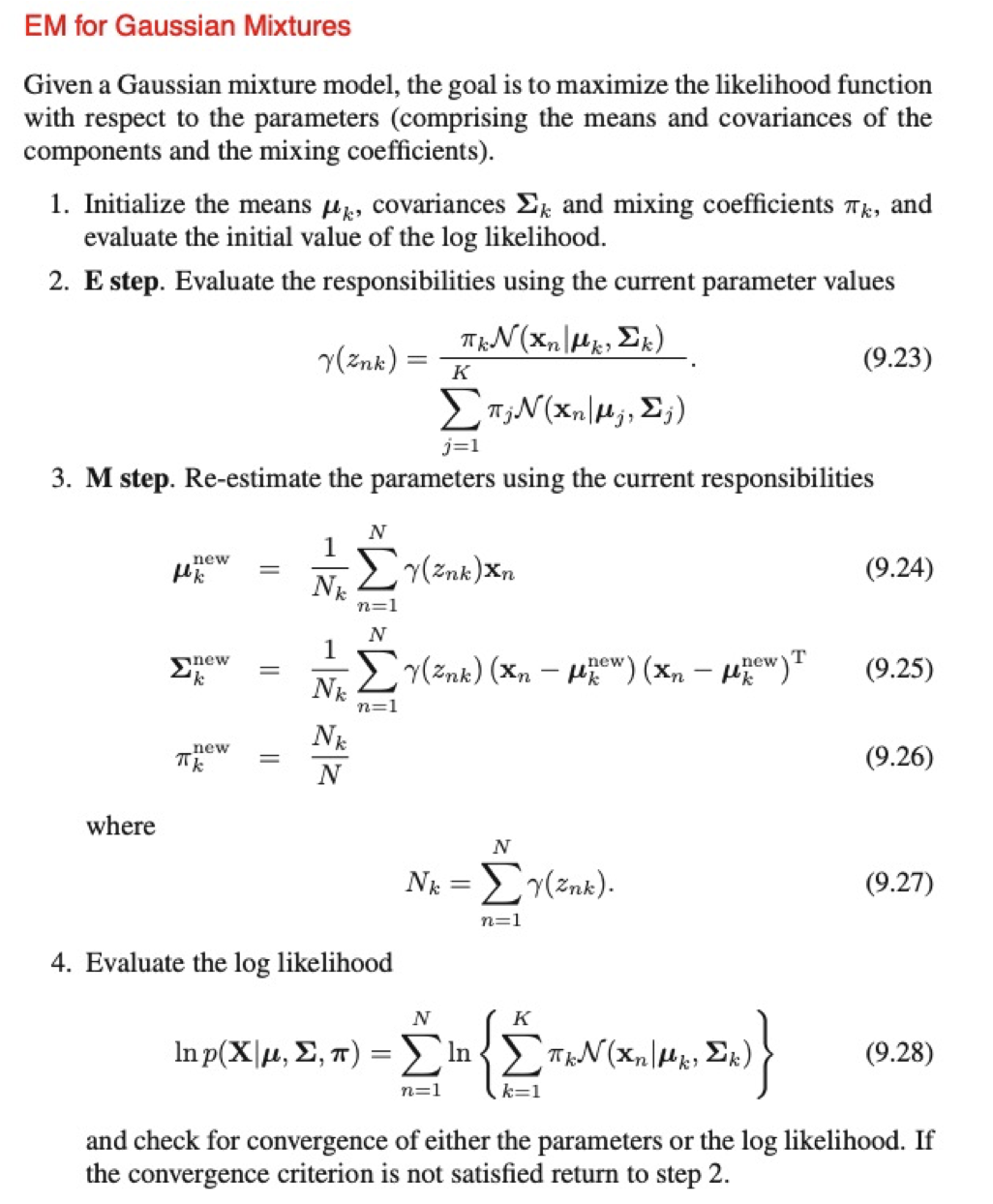 Bishop 형님의 Pattern Recognition책에서 GMM에서의 EM 알고리즘 과정에 대해 아래와 같이 설명하고 있다.