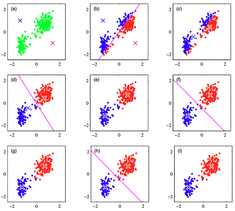 같은 데이터셋으로 K-Means로 클러스터링(K=2)하는 과정은 아래 그림과 같다. a)에서 데이터 포인트들과 초기 centroid $\mu_{1}, \mu_{2}$하고 b)에서 거리에 따라 각 데이터를 클러스터에 할당한다. c)에서 새롭게 centroid를 계산하고 이 과정으로 d)~i)까지 반복하여 최종적인 centroid와 클러스터를 생성한다.