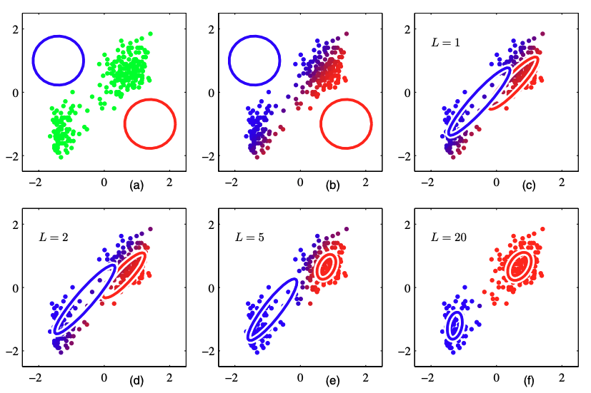 아래 그림은 Pattern Recognition 책에 있는 GMM(K=2) 학습 과정이다. a)는 데이터포인트들과 초기 Gaussian distribution가 위치해있다. b)는 초기값 상황에서 첫 E step을 통해 각 데이터에 대해서 responsibility를 계산한 결과이다. c)는 첫 M step을 통해 각 Gaussian distribution의 mean, covariance를 계산한 결과이다. d), e), f)는 각각 EM 알고리즘을 2번, 5번, 20번 반복한 결과이며 f)가 converge에 가까운 결과이다.