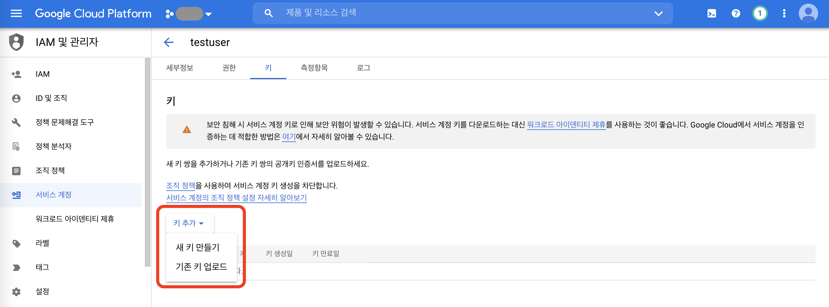 계정 클릭 후 '키'를 누르고 키 추가를 선택하여 새 키를 만들어준다. 새 키 만들기 버튼을 누르고 json 유형을 선택하고 만들기를 누르면 json 파일이 받아진다. 이를 로컬이나 서버 작업환경에 옮겨둔다.