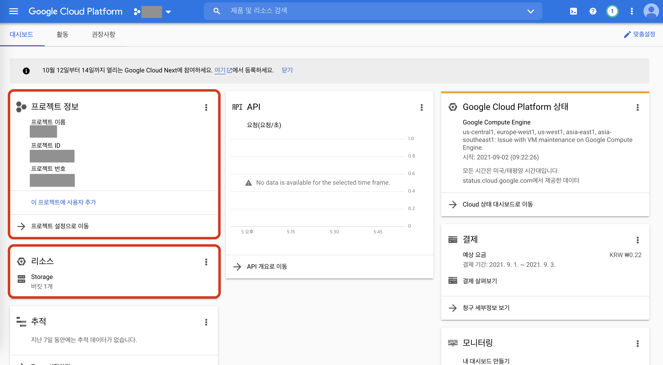 구글 Cloud Console에서 프로젝트, storage, 그리고 storage에서 bucket을 생성해둔다. 다 되었다면 Cloud Console에서 아래 화면과 같이 보인다.