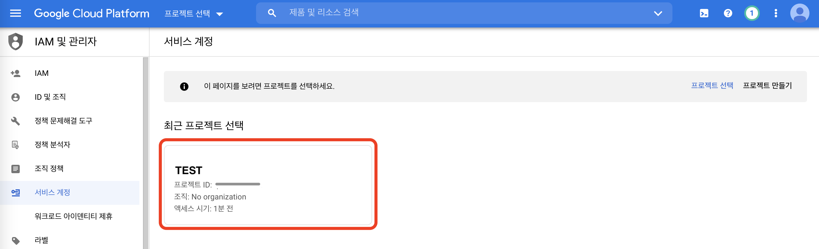 Cloud Console에서의 서비스 계정 만들기 페이지로 이동해서 생성하기 시작한다. 아래 화면이 해당 페이지이며 여기서 인증할 프로젝트를 선택한다.