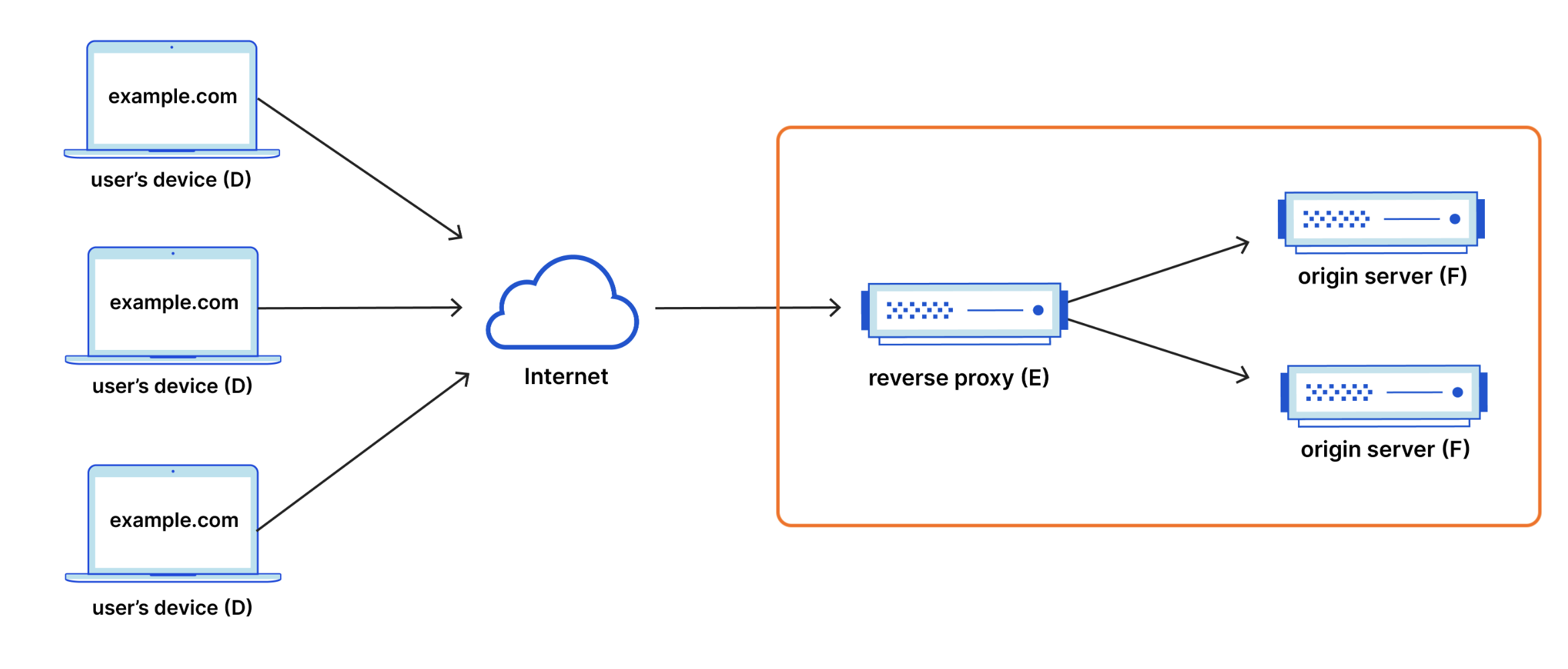 위 그림에서 처럼 외부 사용자를 D, reverse proxy 서버를 E, 응답을 내어줄 서버를 F라고 하자. 일반적으로는 D가 직접 F에게 요청하지만 reverse proxy를 사용하면 D의 요청을 E가 받고, E가 F에게 요청을 보낸다. 이후 받은 응답을 E가 다시 D에게 보내게 된다.