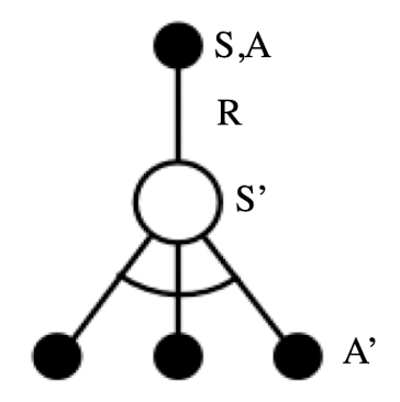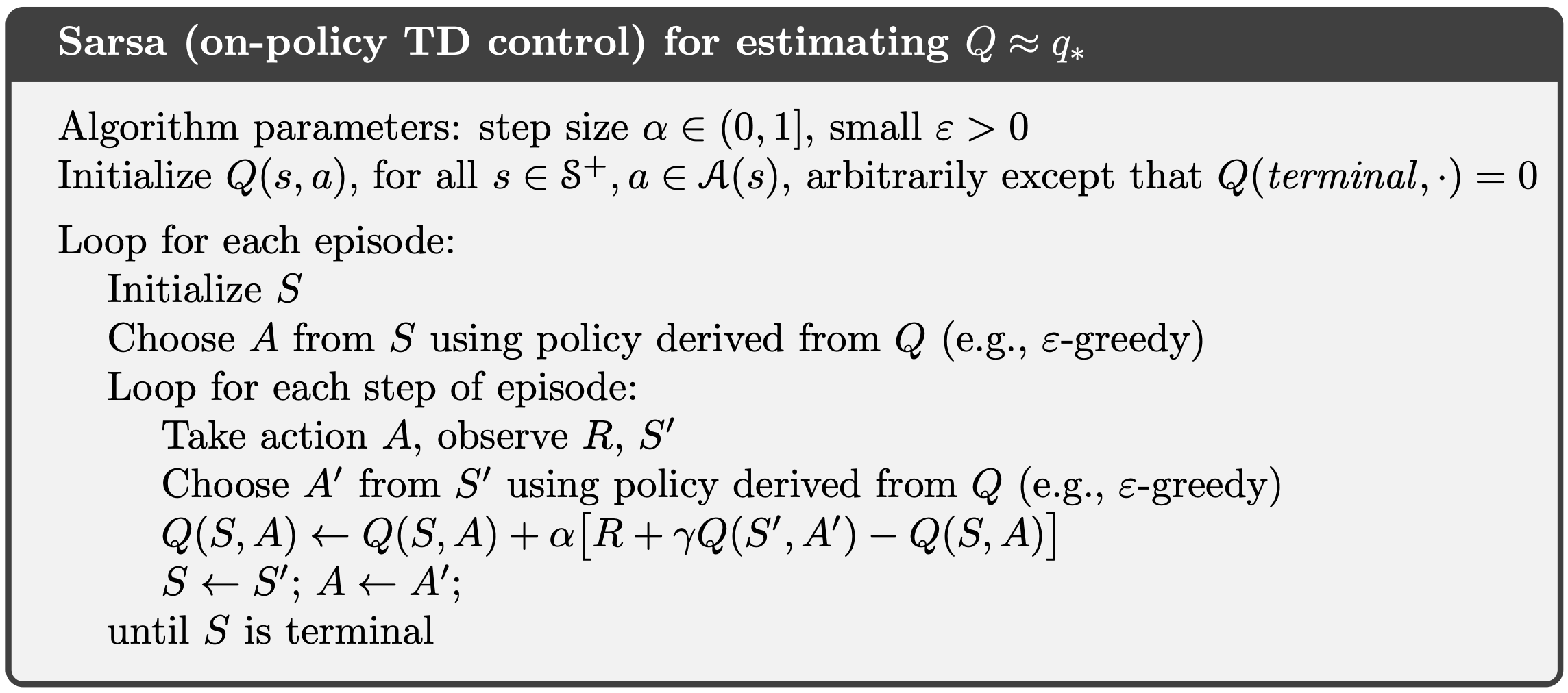 In the previous section we considered transitions from state to state and learned the values of states. Now we consider transitions from state–action pair to state–action pair, and learn the values of state–action pairs. Formally these cases are identical: they are both Markov chains with a reward process. $$Q(S,A) \leftarrow Q(S,A)+\alpha(R+\gamma Q(S^{'},A^{'})-Q(S,A))$$ This update is done after every transition from a nonterminal state $S_{t}$(if $S_{t+1}$ is terminal, then $Q(S_{t+1}, A_{t+1})$ is defined as zero). This rule uses every element of the quintuple of events, $\color{blue}(S_{t}, A_{t}, R_{t+1} S_{t+1}, A_{t+1})$, that makes up a transition from one state-action pair to the next. This quintuple gives rise to the name Sarsa for the algorithm.