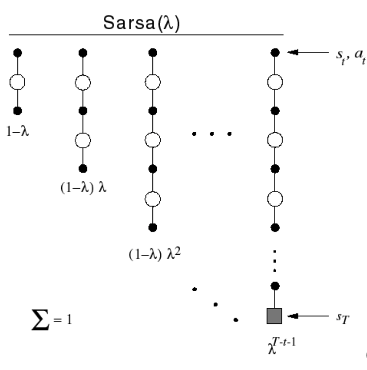 The $q^{\lambda}$ return combines all $n$-step $Q$-returns $q_{t}^{n}$(결국 한 episode가 끝날 때 까지 기다려야 함. Backward view가 필요한 이유), using weight $(1-\lambda)\lambda^{n-1}$