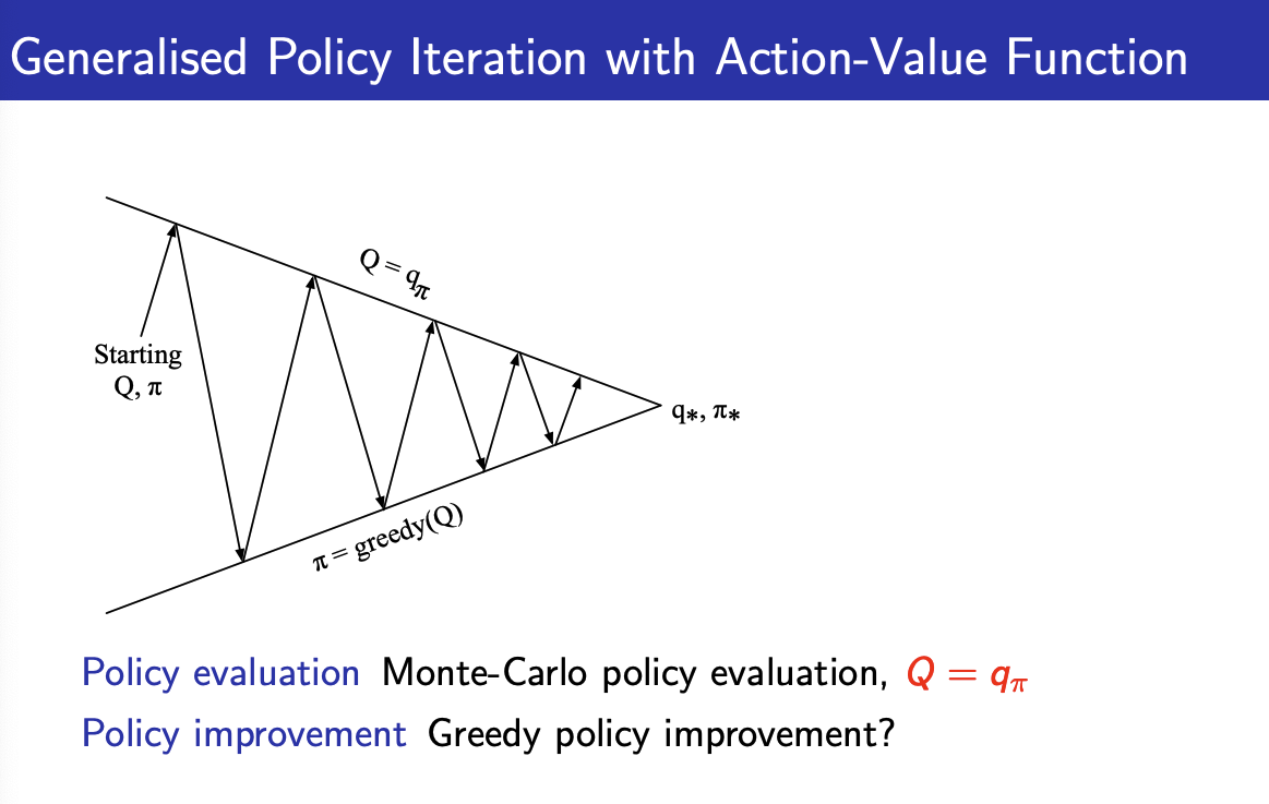 Policy evaluation: run some episodes using current policy, estimate the value of all actions from all states just from what we've seen(for every state & action pair we look at the mean return)(계속 explore하기 때문에 매우 느리고 비효율적일 수 있음)