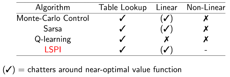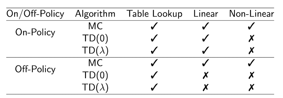| LSTD($\color{blue}\lambda$) | Least Squares TD($\lambda$) uses $\lambda$-return $v_{t}^{\pi} \approx \color{red}G_{t}^{\lambda}$ |