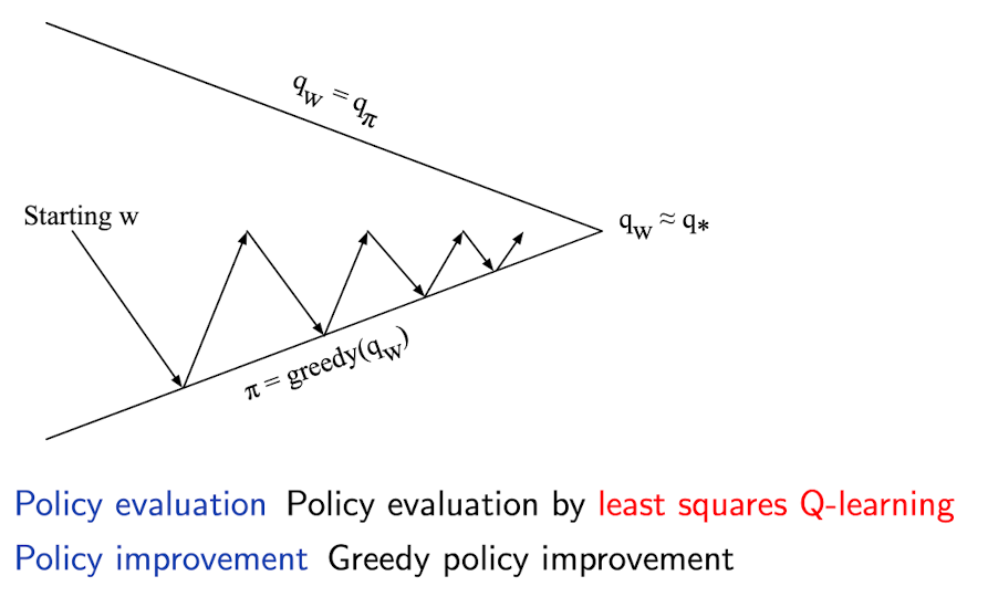 - Minimized least squares error between $\hat{q}(s,a,\mathrm{w})$ and $q_{\pi}(s,a)$