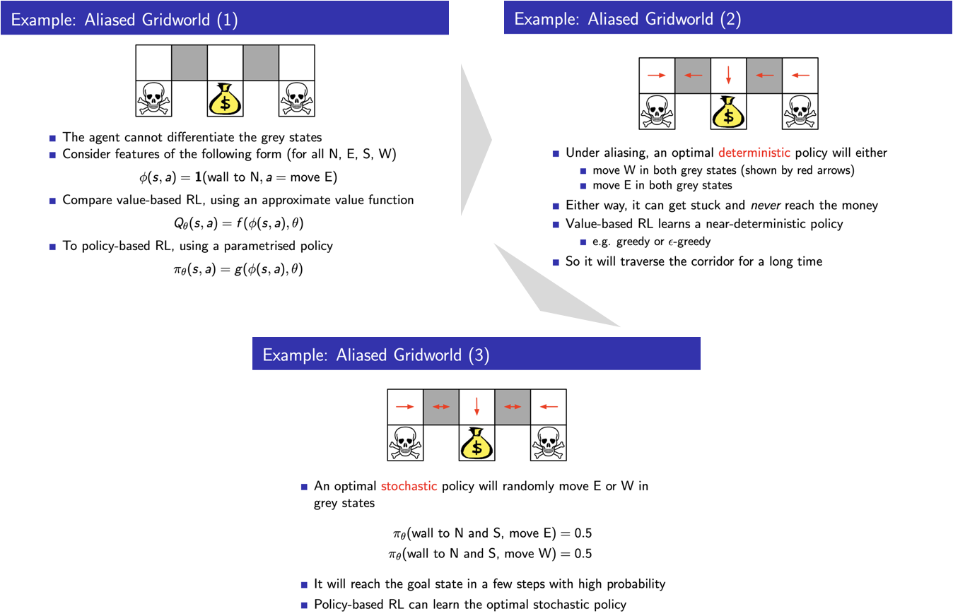- Policy gradient algorithms search for a local maximum in $J(\theta)$ by ascending the gradient of the policy, w.r.t parameters $\theta$