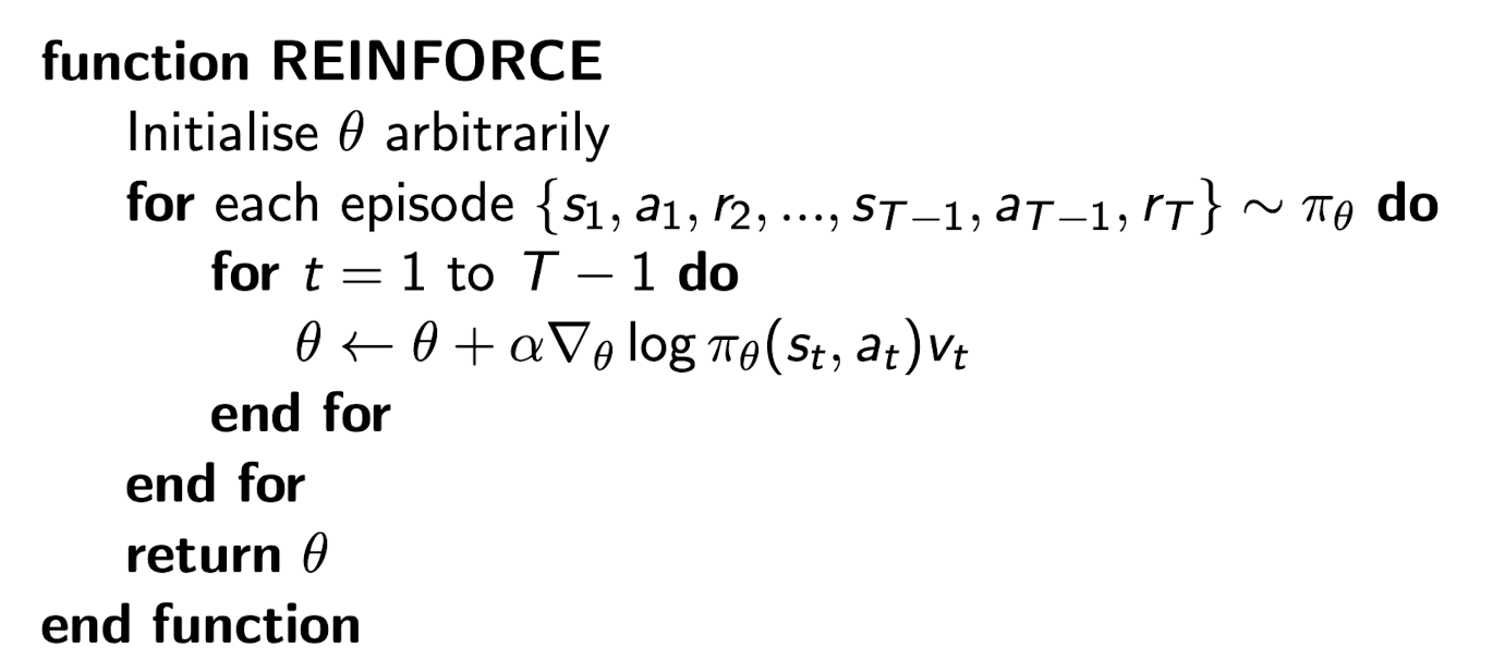 $$\Delta\theta_{t}= \alpha\nabla_{\theta}\text{log} \ \pi_{\theta}(s_{t},a_{t})v_{t}$$
