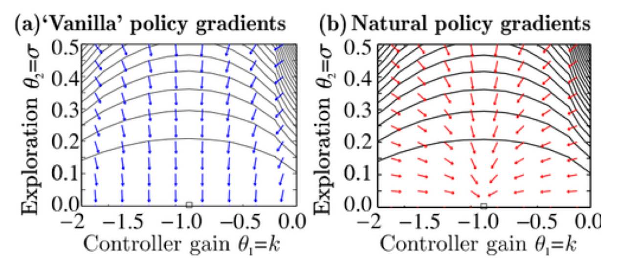 $$\nabla_{\theta}^{\text{nat}}\pi_{\theta}(s,a) = G^{-1}_{\theta}\nabla_{\theta}\pi_{\theta}(s,a)$$