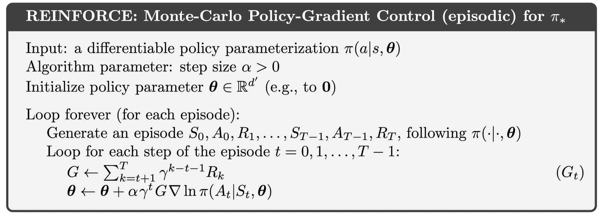 $$\nabla \mathbb{E}_{\pi_{\theta}}[r(\tau)] = \mathbb{E}_{\pi_{\theta}}\left[ \left( \sum_{t=1}^{T}G_{t}\nabla \text{log}\pi_{\theta}(a_{t}|s_{t}) \right) \right]$$
